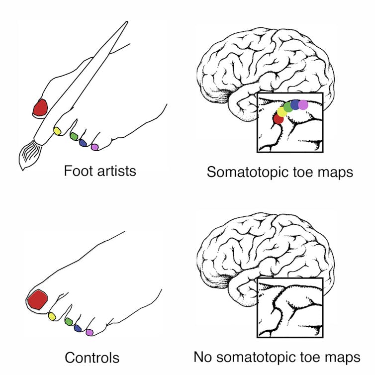 We used ultra high-res brain scanning to reveal clear maps of individual toes in two foot painters, born without either arm. While these organised toe maps are not found in typically developed humans, they are found in monkeys – who, like the foot painters, use their toes in skilled ways.