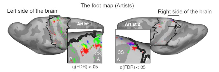 Using new analysis methods, we showed the pattern of brain activity in the foot area resulting from touching the artists’ toes was highly similar to a typical hand pattern. That is, the pattern generated by touching the fingers of two-handed people, in their brain’s hand area.