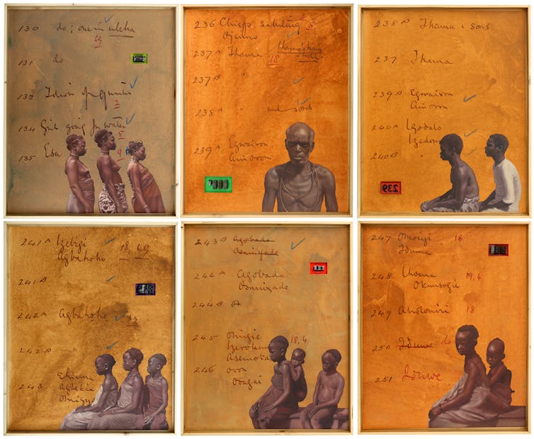 It’s an extraordinary collection of portraits from Nigeria and Sierra Leone taken between 1909 and 1915, when Britain was at the height of its empire. The archive shows a vast array of faces – of women, children and men – some distant, some suspicious, some proud, some confused, some joyous. Most are photographed against a canvas backdrop, some with number boards above their heads, all of them silent.