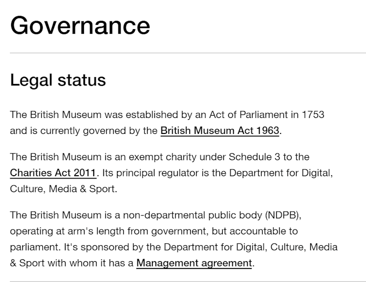 The British Museum itself cites arm’s length as its governance principle, as you can see from this extract below: