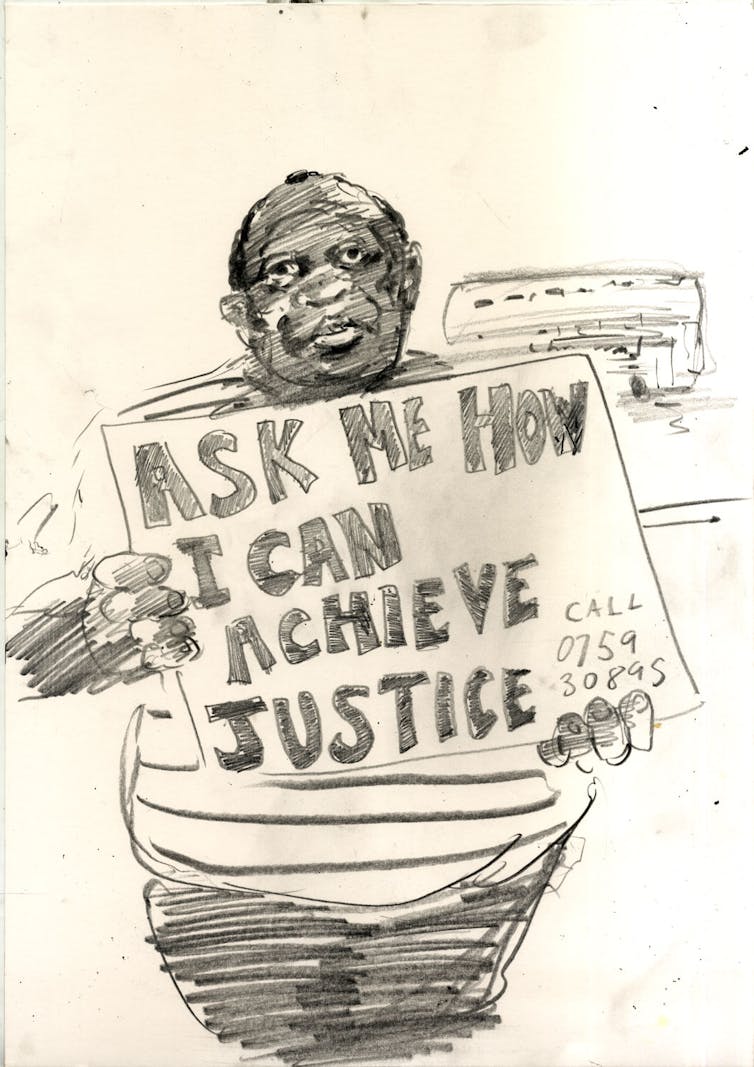 The use of illustrations also played into this ethical question about representation. Arguably, drawing occupies less fraught terrain than photography – which, as the US writer, filmmaker, philosopher and teacher, Susan Sontag, notes is “context determined”. In other words, photography as a medium can confirm and sustain power dynamics as the subject will often lack access to and control over their own representation.